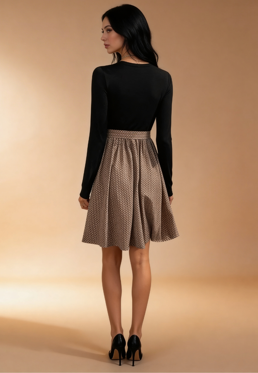 Beżowo-czarna sukienka z geometrycznym wzorem i paskiem