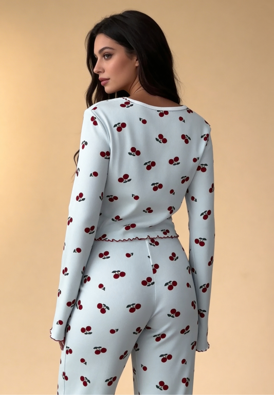 Biały komplet piżamowy damski z długim rękawem i długimi spodniami w wiśnie