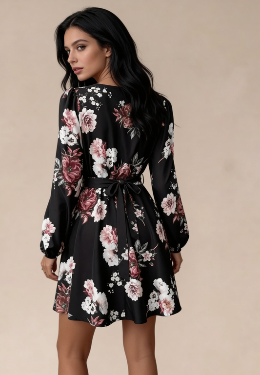 Czarna sukienka w kwiaty z kopertowym dekoltem i wiązaniem w talii