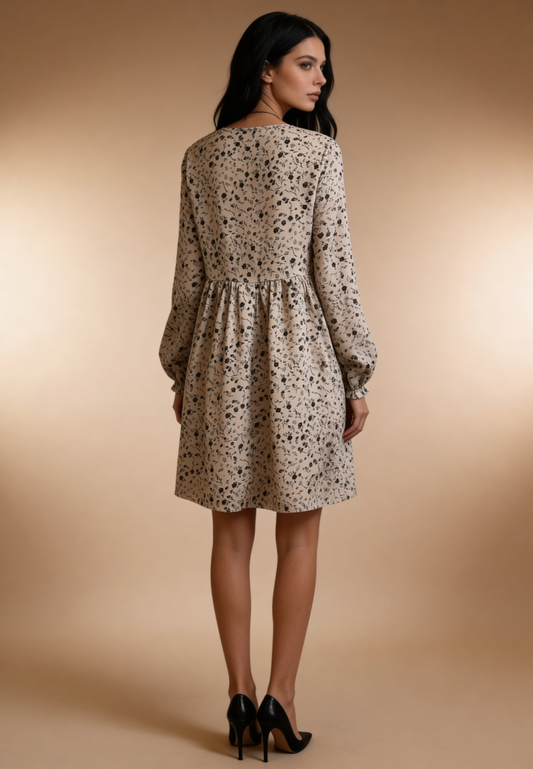 Beżowa sukienka w czarne kwiaty z dekoltem V i długim rękawem