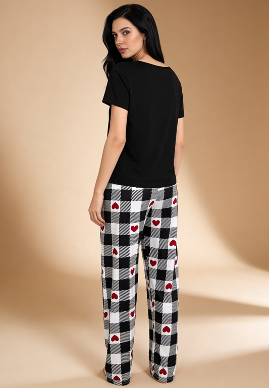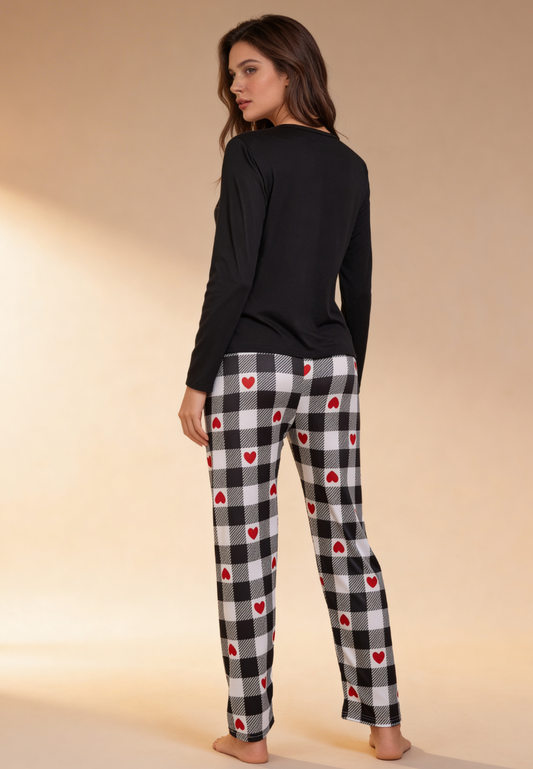 Czarny komplet piżamowy damski z długim rękawem i spodniami w serca