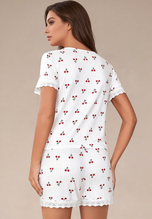 Biały komplet piżamowy damski z krótkim rękawem i spodenkami w wiśnie
