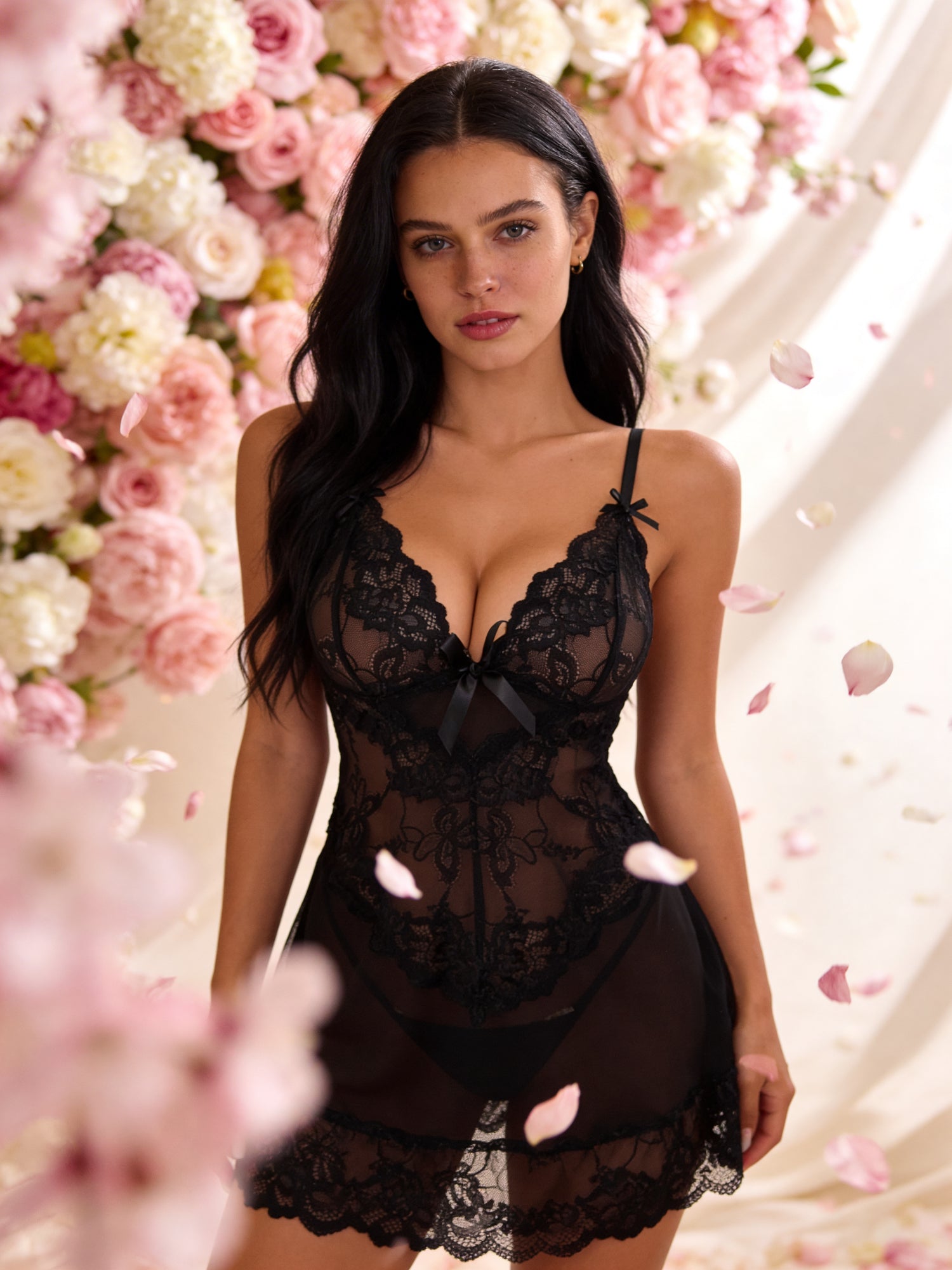 Czarne body damskie koronkowe z głębokim dekoltem i kokardkami