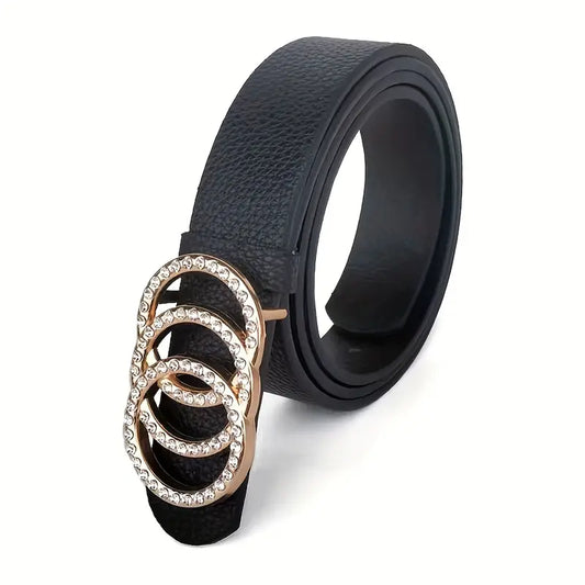Czarny damski pasek z potrójną złotą klamrą i cyrkoniami