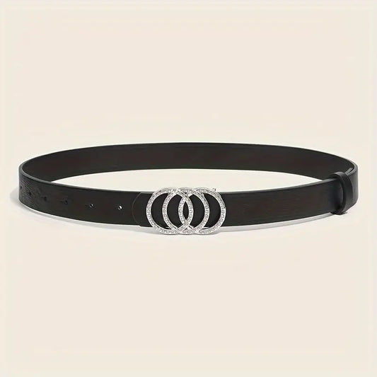 Czarny pasek damski z potrójną srebrną klamrą wysadzaną cyrkoniami