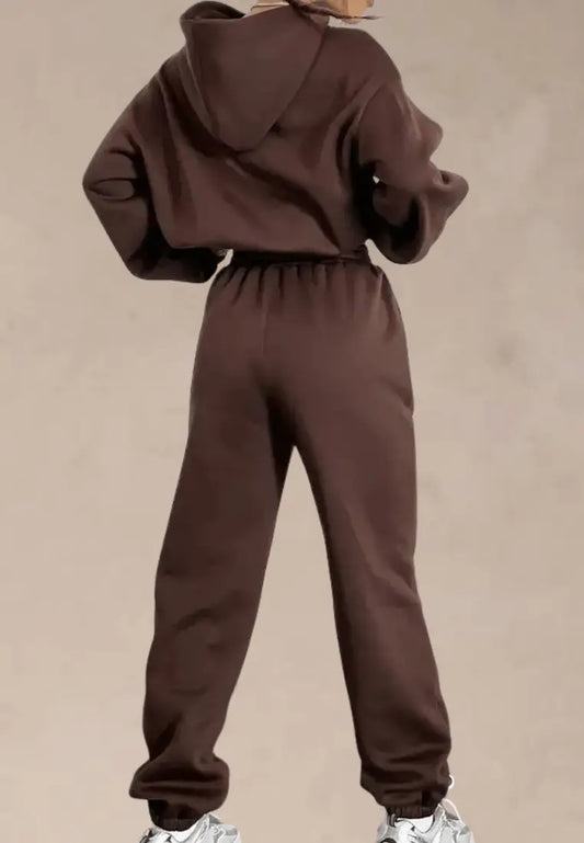 Brązowy komplet dresowy damski z kapturem i elastycznymi nogawkami