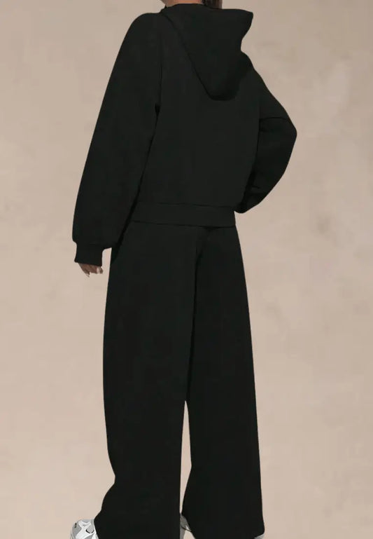 Czarny komplet dresowy damski z kapturem i szerokimi nogawkami