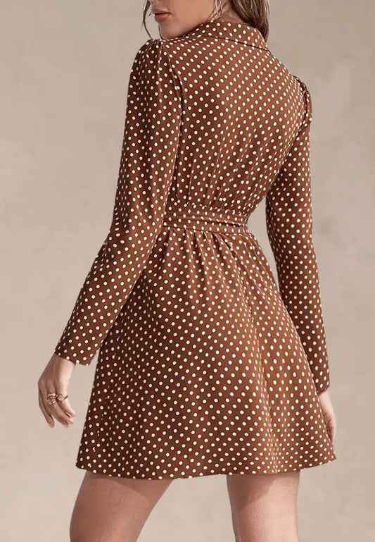 Brązowa sukienka w groszki z kołnierzykiem i wiązaniem w talii