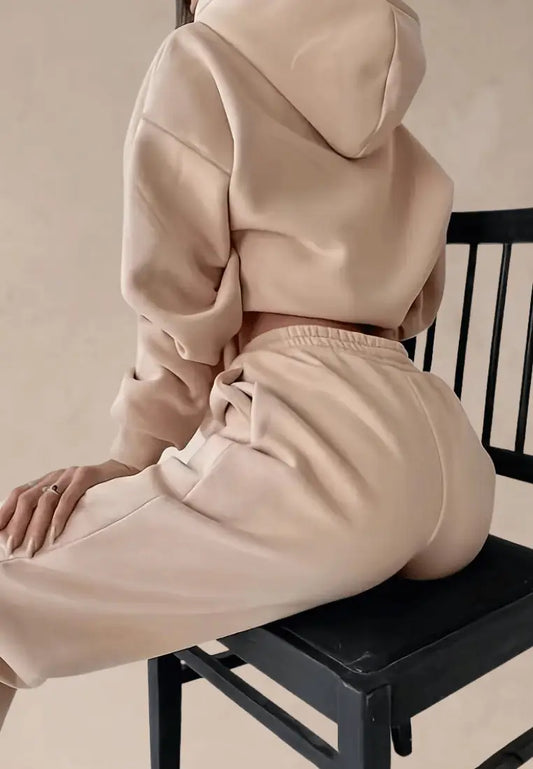 Beżowy komplet dresowy damski z kapturem i elastycznymi nogawkami