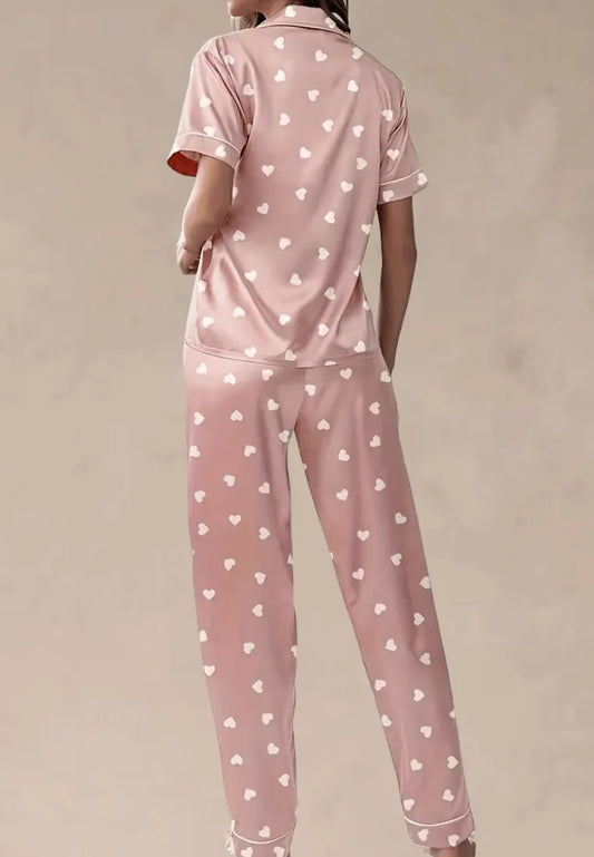 Różowy komplet piżamowy damski z krótkim rękawem i długimi spodniami w serduszka