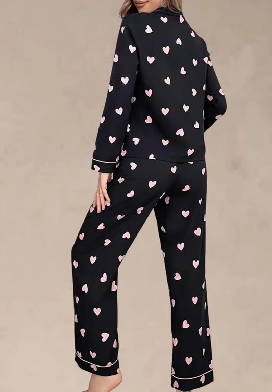 Czarny komplet piżamowy damski z długim rękawem i długimi spodniami w serduszka