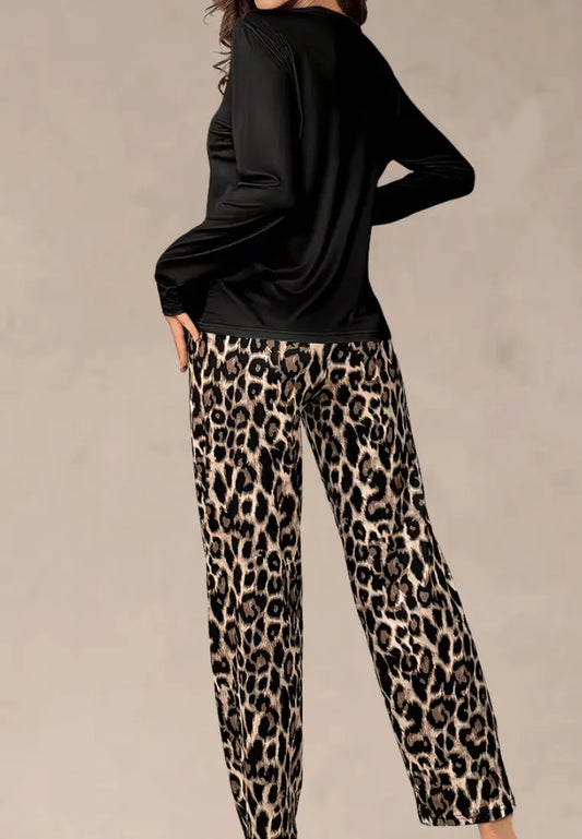 Czarny komplet piżamowy damski z długim rękawem i długimi spodniami w panterkę