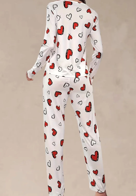 Biały komplet piżamowy damski z długim rękawem i spodniami w czerwone serduszka