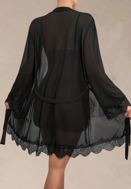 Czarny zestaw piżamowy damski z koszulą nocną i szlafrokiem z koronką