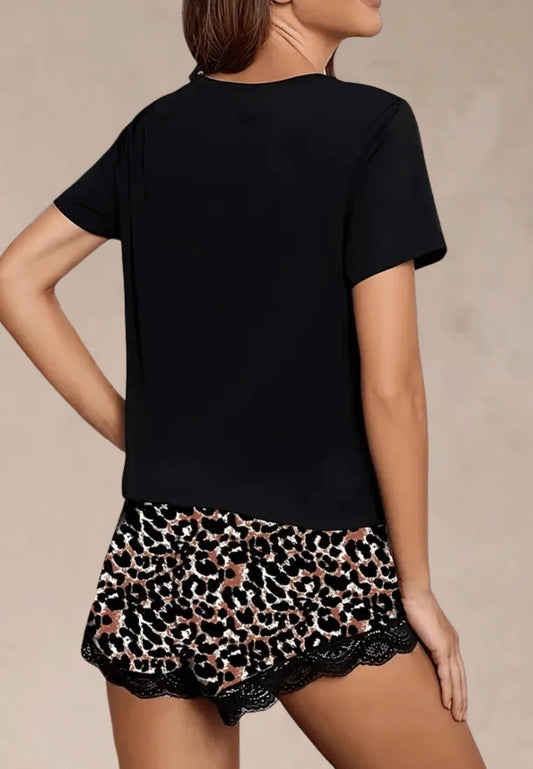 Czarny komplet piżamowy damski z krótkim rękawem i szortami w panterkę