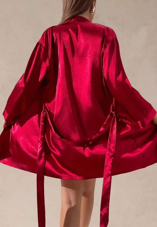 Czerwony szlafrok damski satynowy z długim rękawem i wiązaniem w pasie