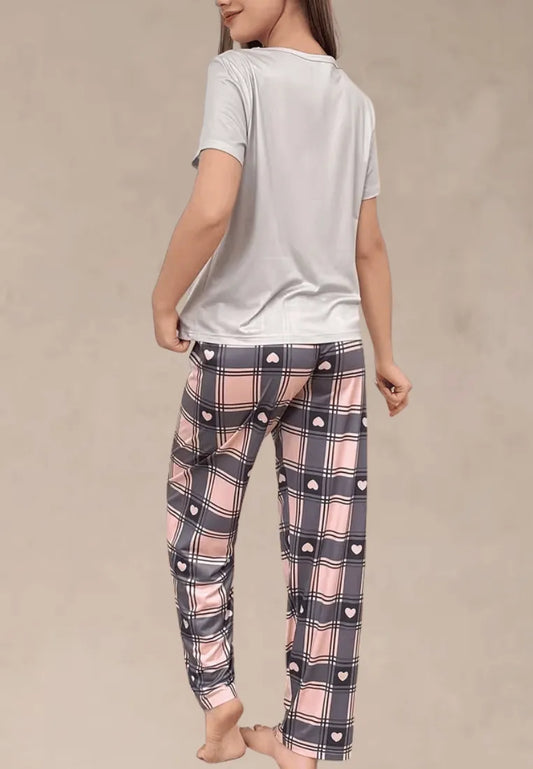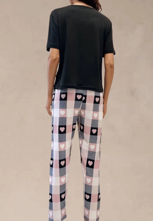 Komplet piżamowy damski z krótkim rękawem i długimi spodniami w kratę z serduszkami