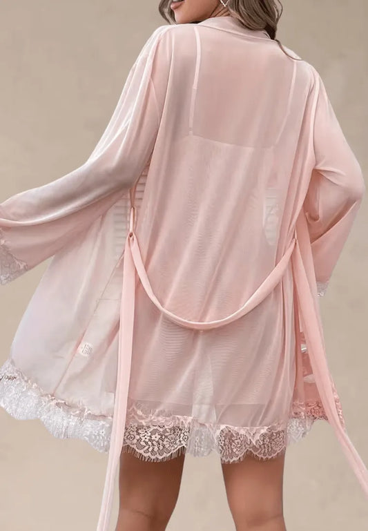Różowy zestaw piżamowy damski na ramiączkach z koszulą nocną i szlafrokiem z koronką