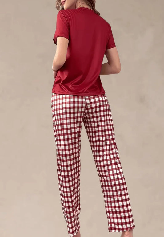Czerwony komplet piżamowy damski z krótkim rękawem i długimi spodniami w kratę