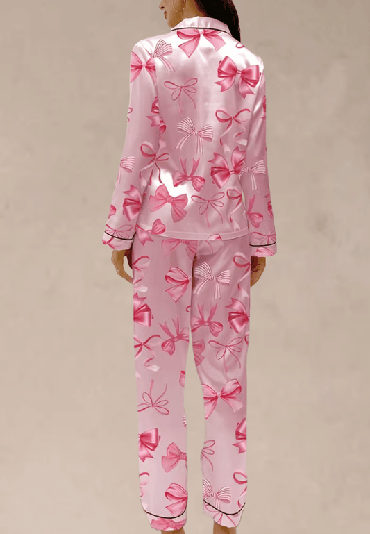 Różowy komplet piżamowy damski z długim rękawem i długimi spodniami w kokardki