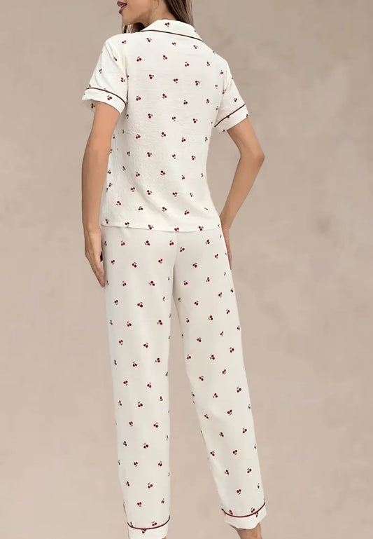 Biały komplet piżamowy damski z krótkim rękawem i długimi spodniami w wiśnie