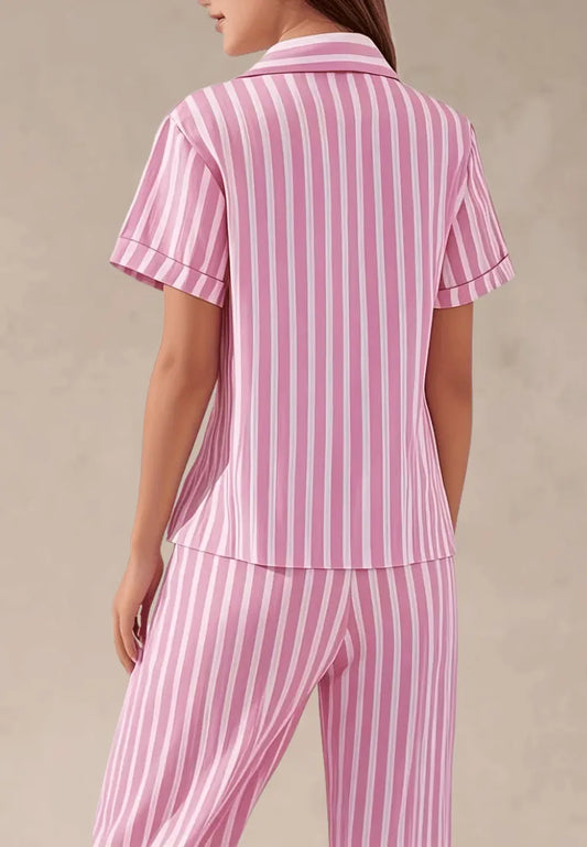 Różowy komplet piżamowy damski z krótkim rękawem i długimi spodniami w paski