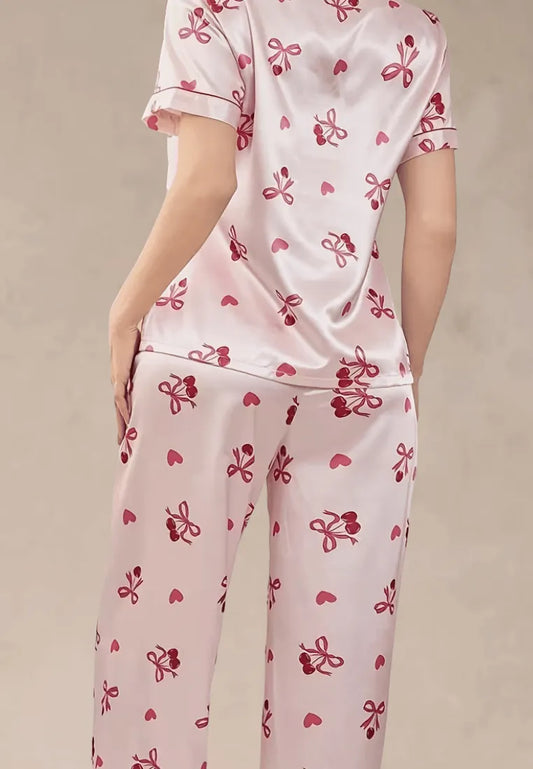 Różowy komplet piżamowy damski z krótkim rękawem i spodniami w serduszka i kokardki