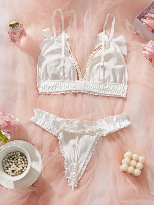 Komplet bielizny biały satynowy z perełkami i falbankami