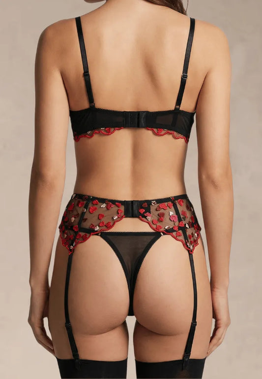 Czarno-czerwony zestaw bielizny damski haftowany w serca z pasem do pończoch