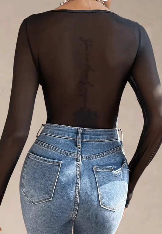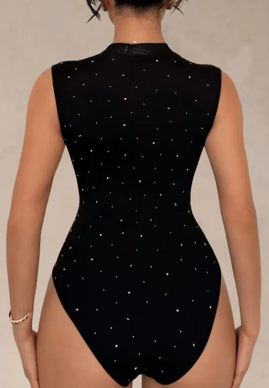 Czarne body damskie z siateczkowym dekoltem i ozdobnymi kryształkami