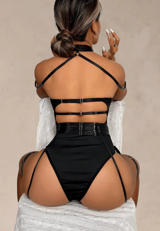 Czarny zestaw bielizny damski z siateczki z harnessami, chokerem i paskami na uda