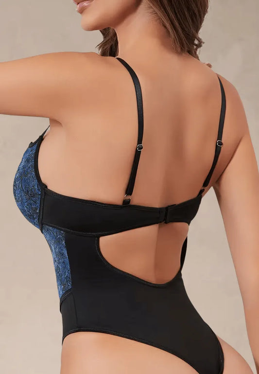 Niebiesko-czarne body damskie gorsetowe z koronkowym wzorem i wiązaniem z przodu