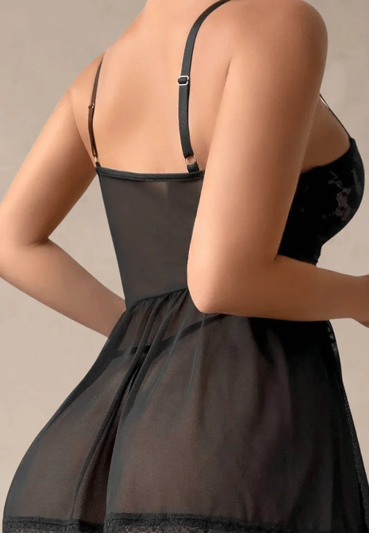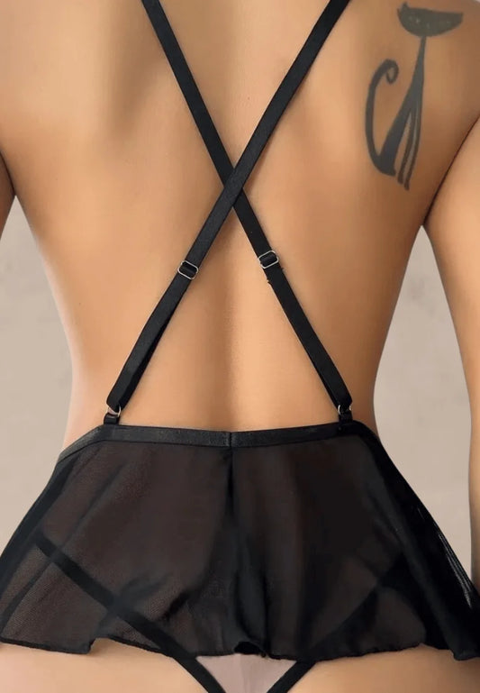 Czarne body damskie koronkowe z głębokim dekoltem i tiulową spódniczką