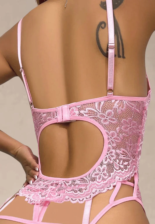 Różowy zestaw bielizny damski koronkowy z wycięciami, falbankami i paskami do pończoch