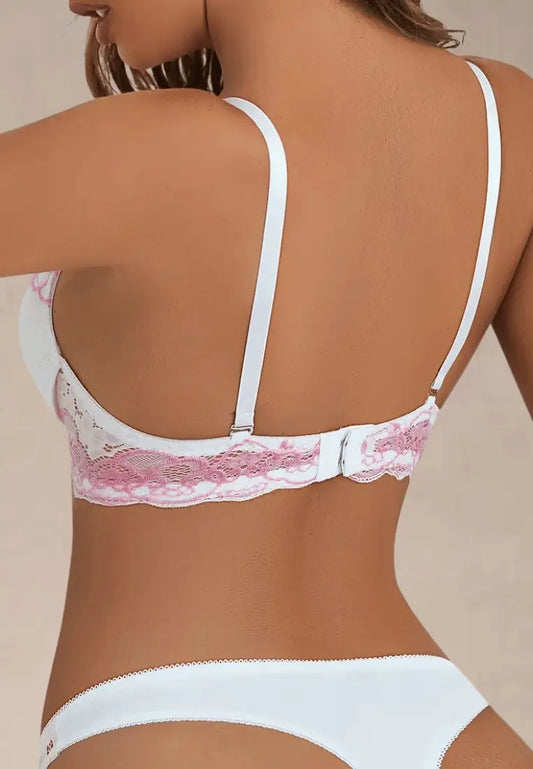 Biały komplet bielizny damski biustonosz i stringi haft różowe kwiaty