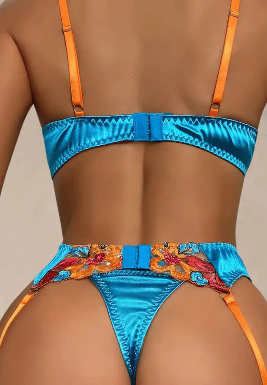 Niebieski zestaw bielizny damski z biustonoszem stringami i pasem