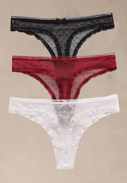 Zestaw 3 szt. stringi majtki damskie koronkowe bawełniane czarne, białe i czerwone