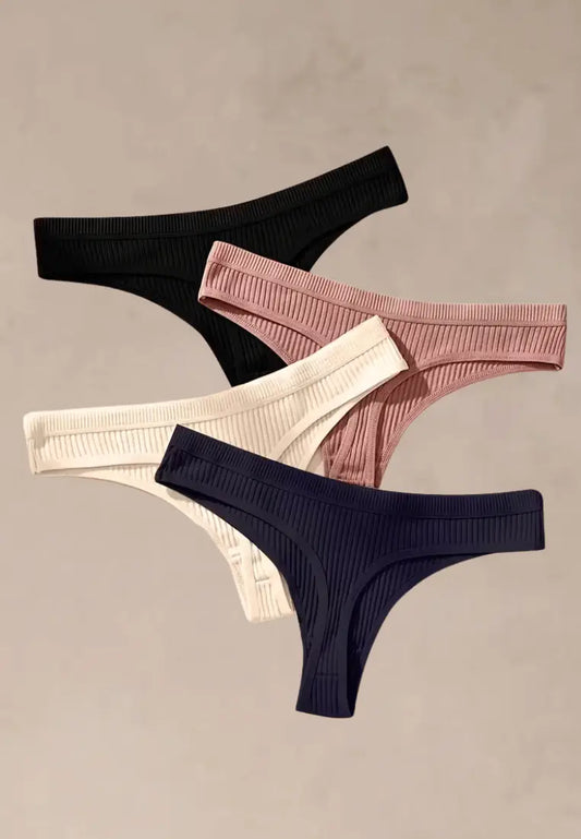 Zestaw 4 szt. stringi majtki damskie bawełniane prążkowane czarne, białe, pudrowe i granatowe