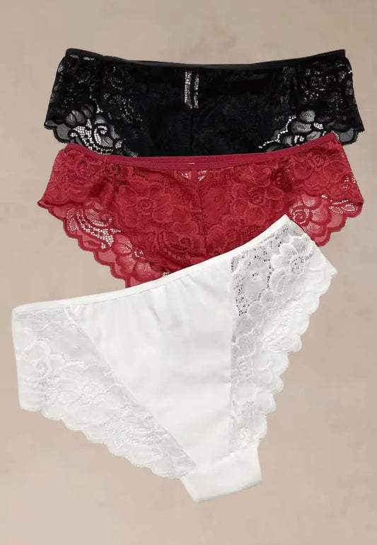 Zestaw 3 szt. figi majtki damskie koronkowe bawełniane czarne, białe i czerwone