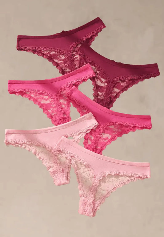 Zestaw 6 szt. stringi majtki damskie koronkowe bawełniane różowe i bordowe