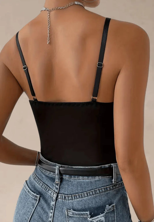 Czarne body damskie gorsetowe z siateczką i kryształkami na ramiączkach