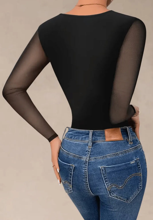 Czarne body damskie gorsetowe z siateczką i kryształkami na długi rękaw