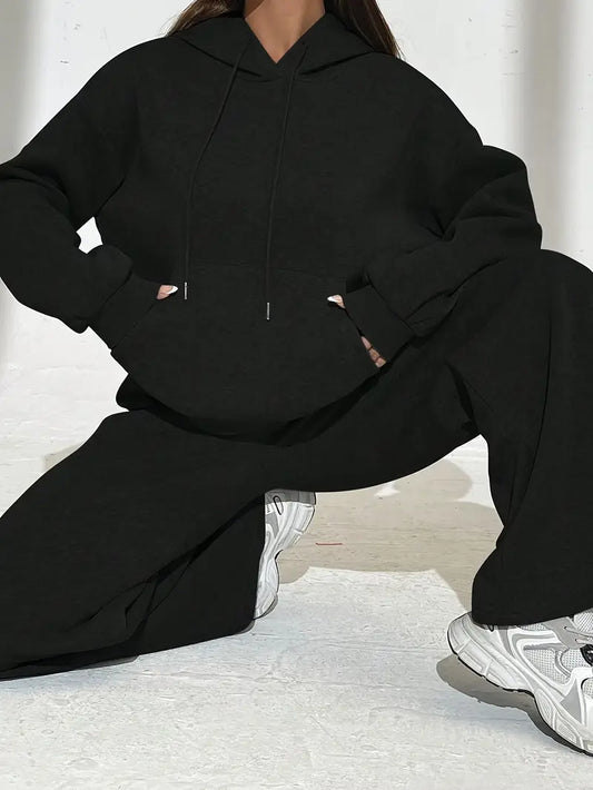 Czarny damski komplet dresowy z szerokimi spodniami i kapturem