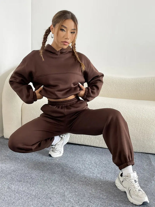 Brązowy damski dres z kapturem i spodniami jogger