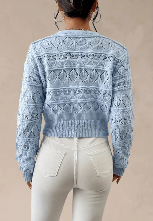 Błękitny kardigan damski ażurowy krótki fason perełkowe guziki