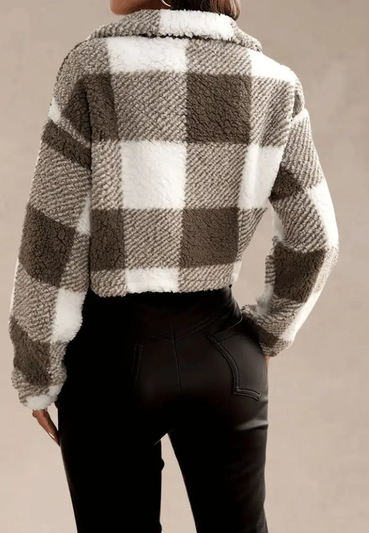 Nowy rok -69%Szara kurtka damska polarowa krótka w kratę na zamek