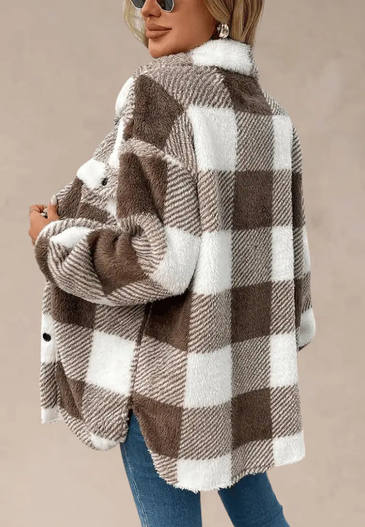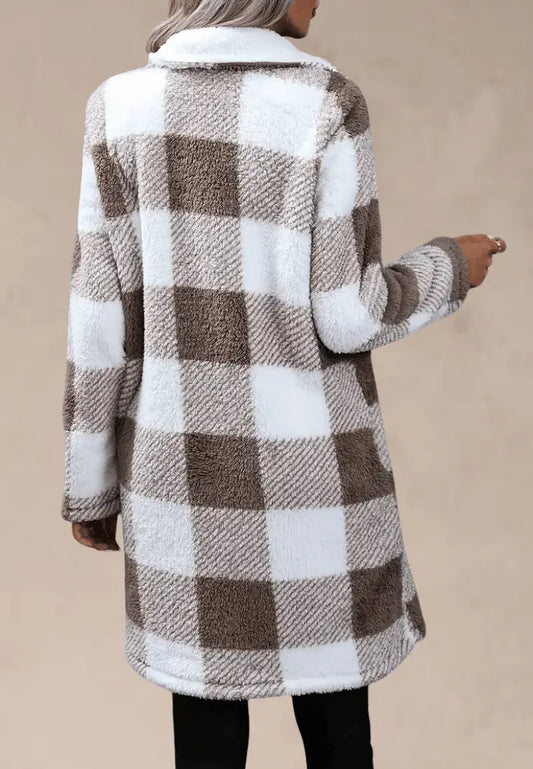 Nowy rok -70%Brązowa kurtka damska polarowa długa w kratę z guzikami