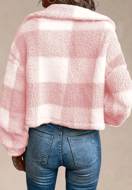 Nowy rok -70%Różowa kurtka damska polarowa krótka w kratę z guzikami