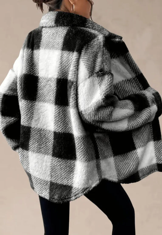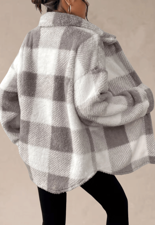 Nowy rok -70%Szara kurtka damska polarowa oversize w kratę z guzikami