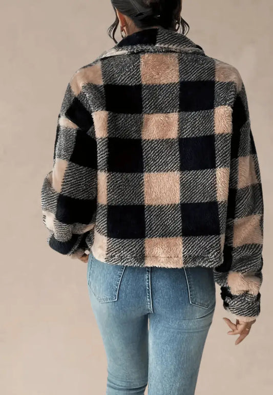 Czarno-beżowa kurtka damska polarowa krótka w kratę z guzikami